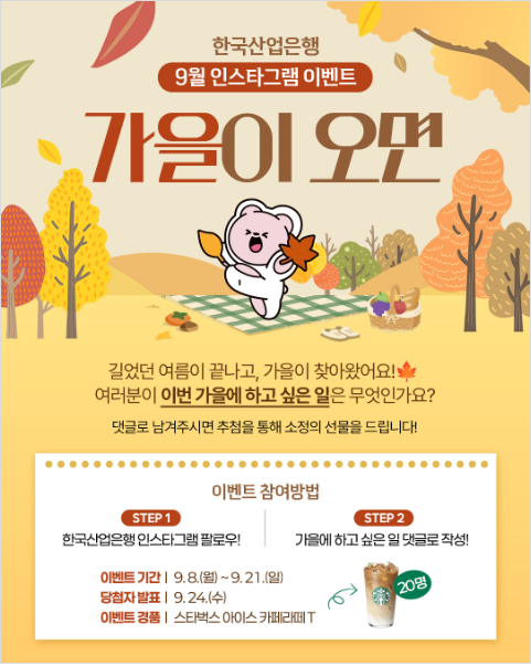 한국산업은행 공식 인스타그램에서 진행하는 가을 맞이 댓글 이벤트입니다. 팔로우 후, 올가을에 하고 싶은 일을 댓글로 남기고 친구를 태그하면 추첨을 통해 스타벅스 아이스 카페 라떼 T(20명)을 드려요. 가을바람처럼 가볍게 참여 GO!