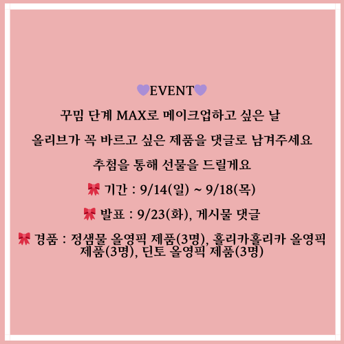- 주제“꾸밈 단계 MAX”로 메이크업하고 싶은 날, 꼭 바르고 싶은 올영픽 제품을 댓글로 남기기
